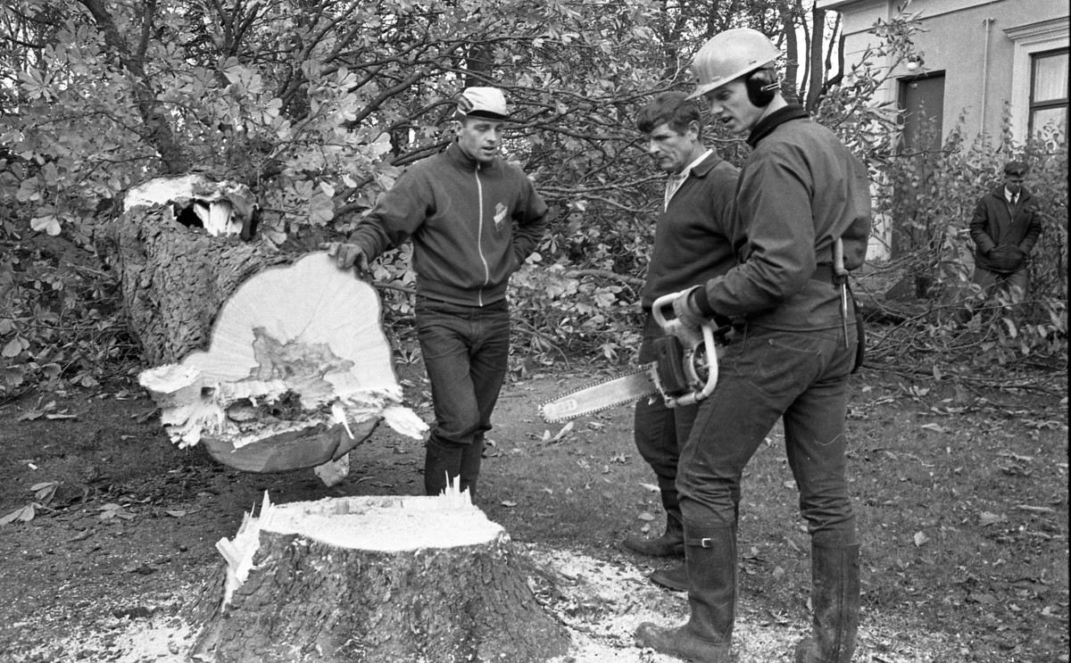 Trädfällning vid prostgården. En stor Kastanj har fallt för motorsågen. Tre män står vid stubben och en fjärde är på väg.