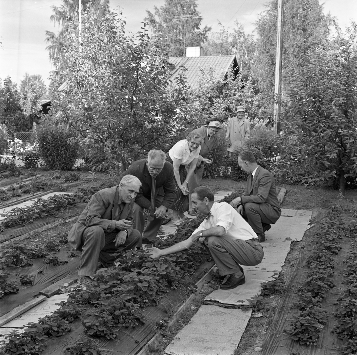 Trädgårdsordlare. Fyra kostymklädda män sitter på huk intill en rad med jordgubbsplantor. Tre kvinnor tittar på.