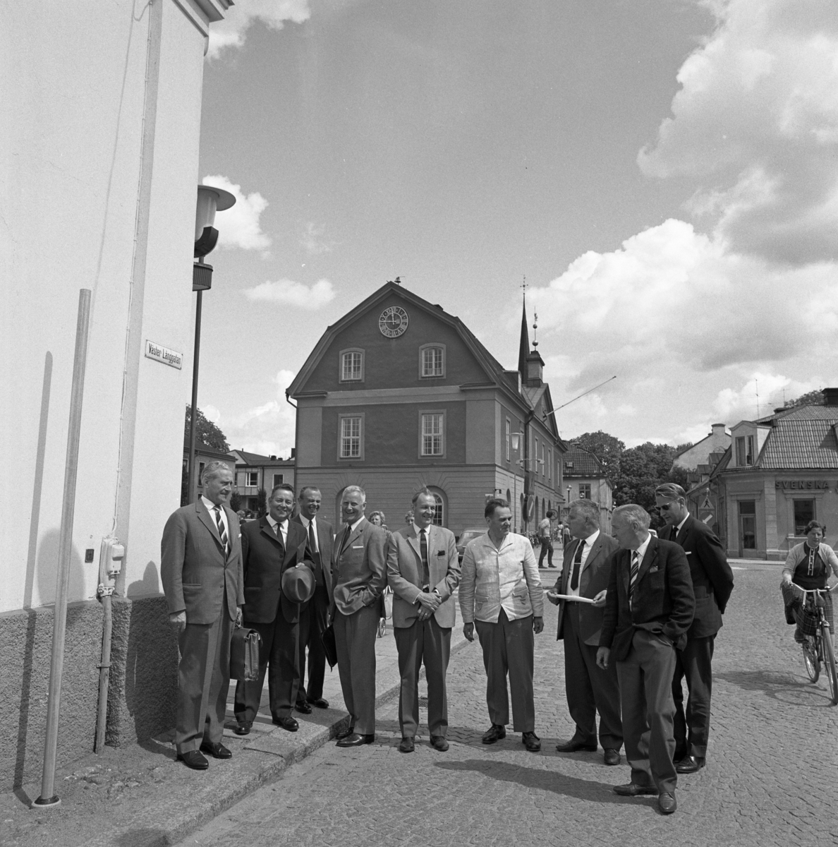 Gruppen står i hörnet Stora torget - Västerlånggatan, intill Lundborgska fastigheten. Bakom dem anas Rådhusets innegård, Rådhuset och Svenska Handelsbanken i Kungsgården.