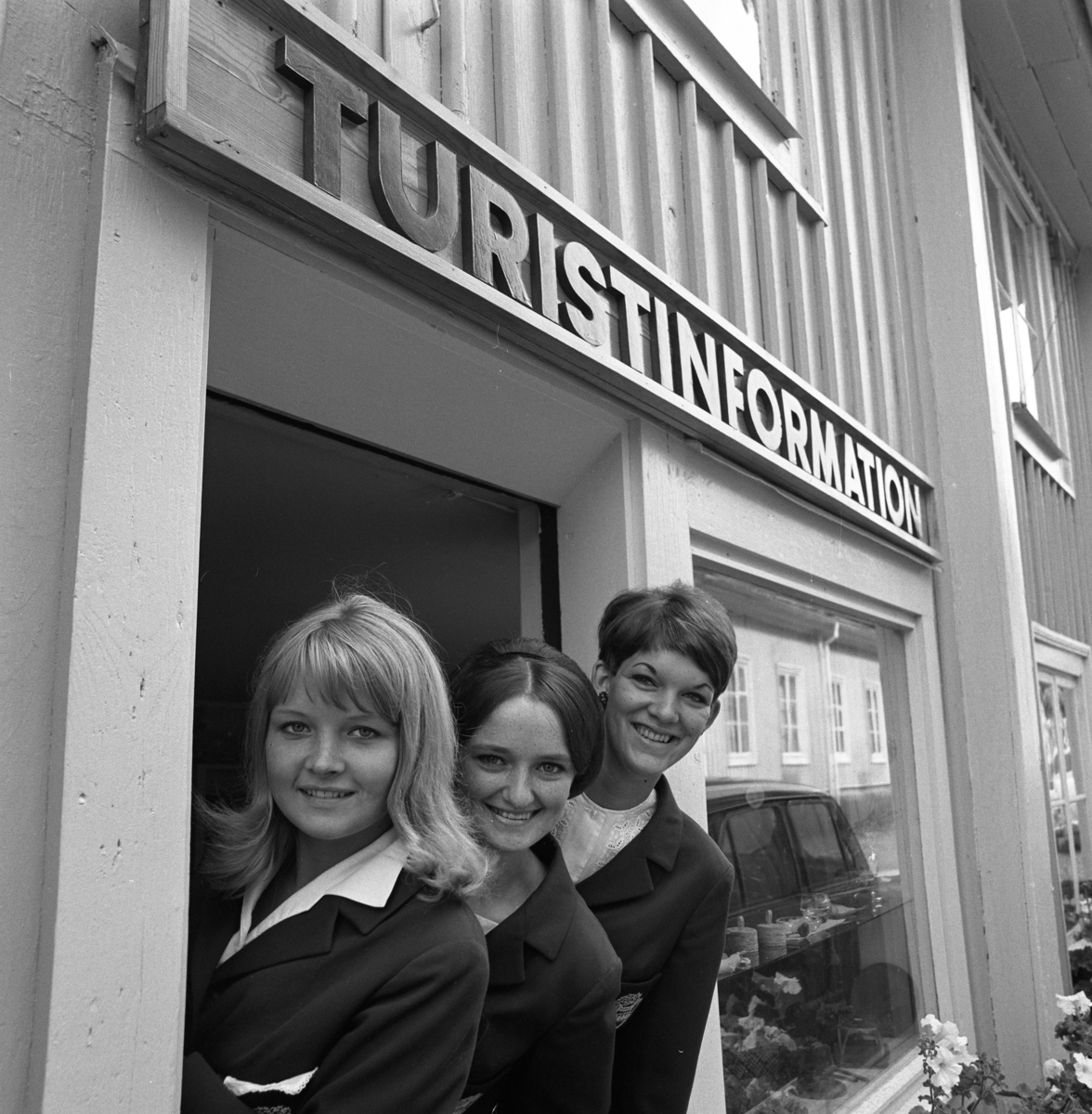 Turistbyrån stänger för säsongen. Tre turistvärdinnor i sina uniformer. Souvernirer visas i skyltfönstret. En balkonglåda, med blommor, sitter på husväggen.