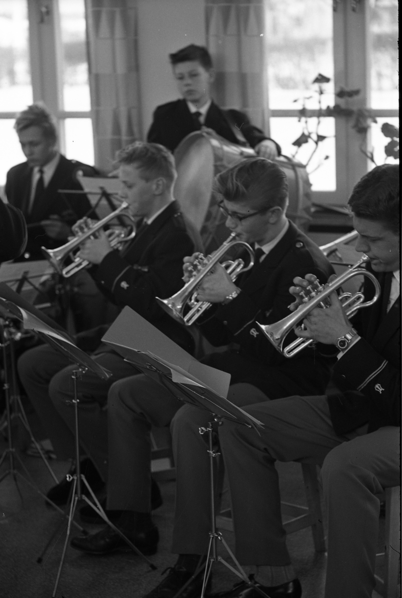 Ungdomsorkestern/Ungdomsblåsorkestern uppträder. Tre grabbar spelar kornett. En slår på stora trumman. Alla är klädda i uniform.