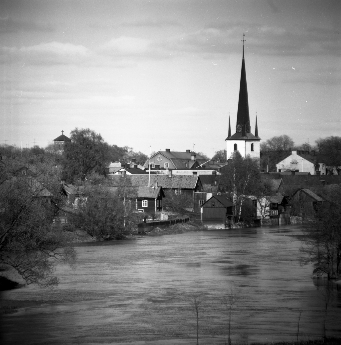 Vy över staden. Arbogaån i förgrunden, ågårdar på norra sidan. Till vänster ses tornet på Sankt Nikolai kyrka/ Nicolai kyrka. I mitten ses Rådhuset med uret på gavlen. Till höger är tornet på Heliga Trefaldighetskyrkan.