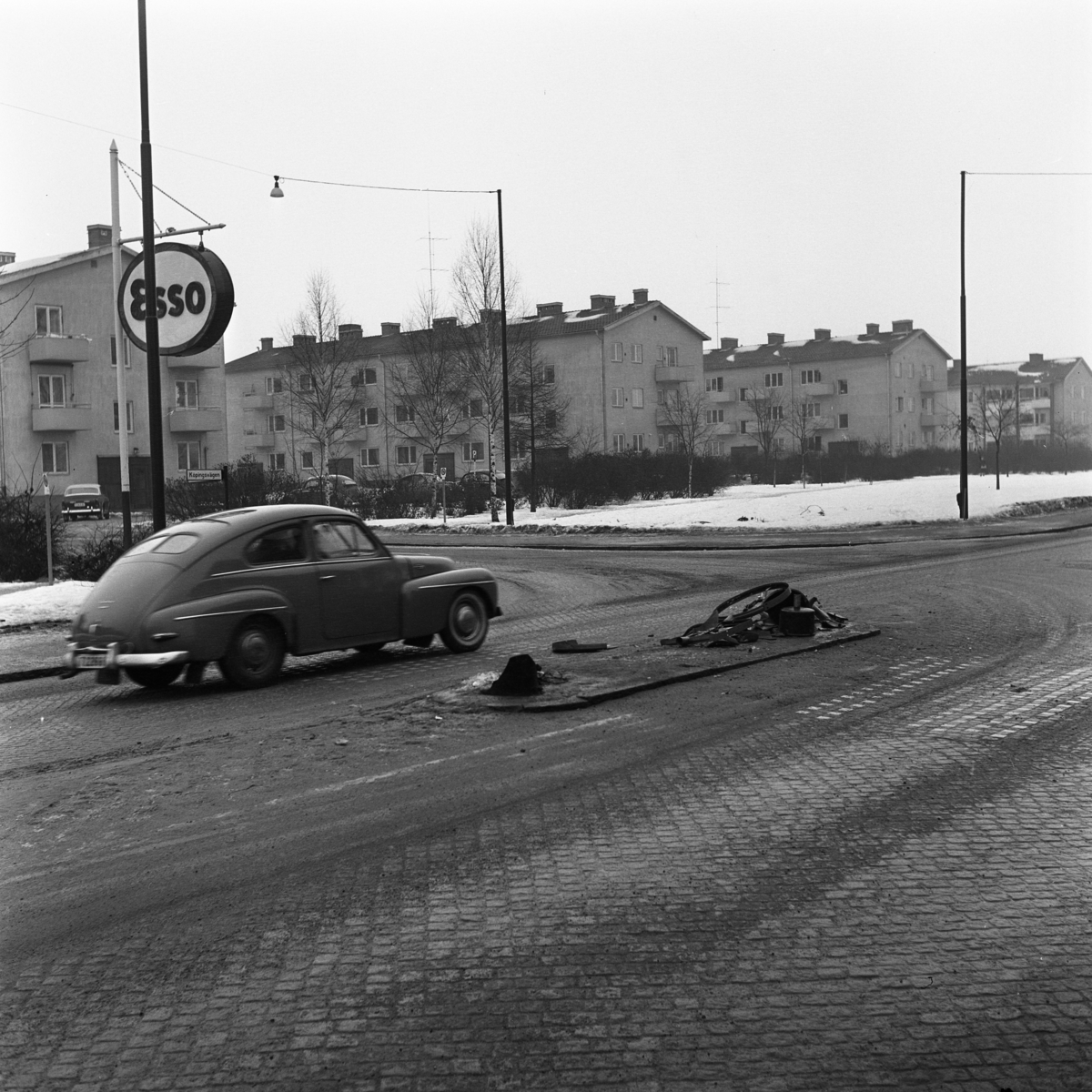 I bilden ses en Volvo PV, en skylt till bensinmacken ESSO samt flerfamiljshus i Vasastan.