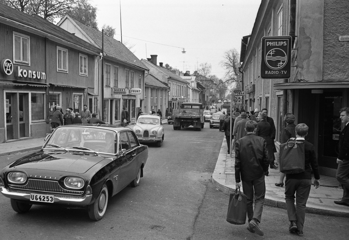 Trafiken på Nygatan. Järntorgsgatan går till höger. Många bilar och många människor i farten. Konsum ligger till vänster i bild.