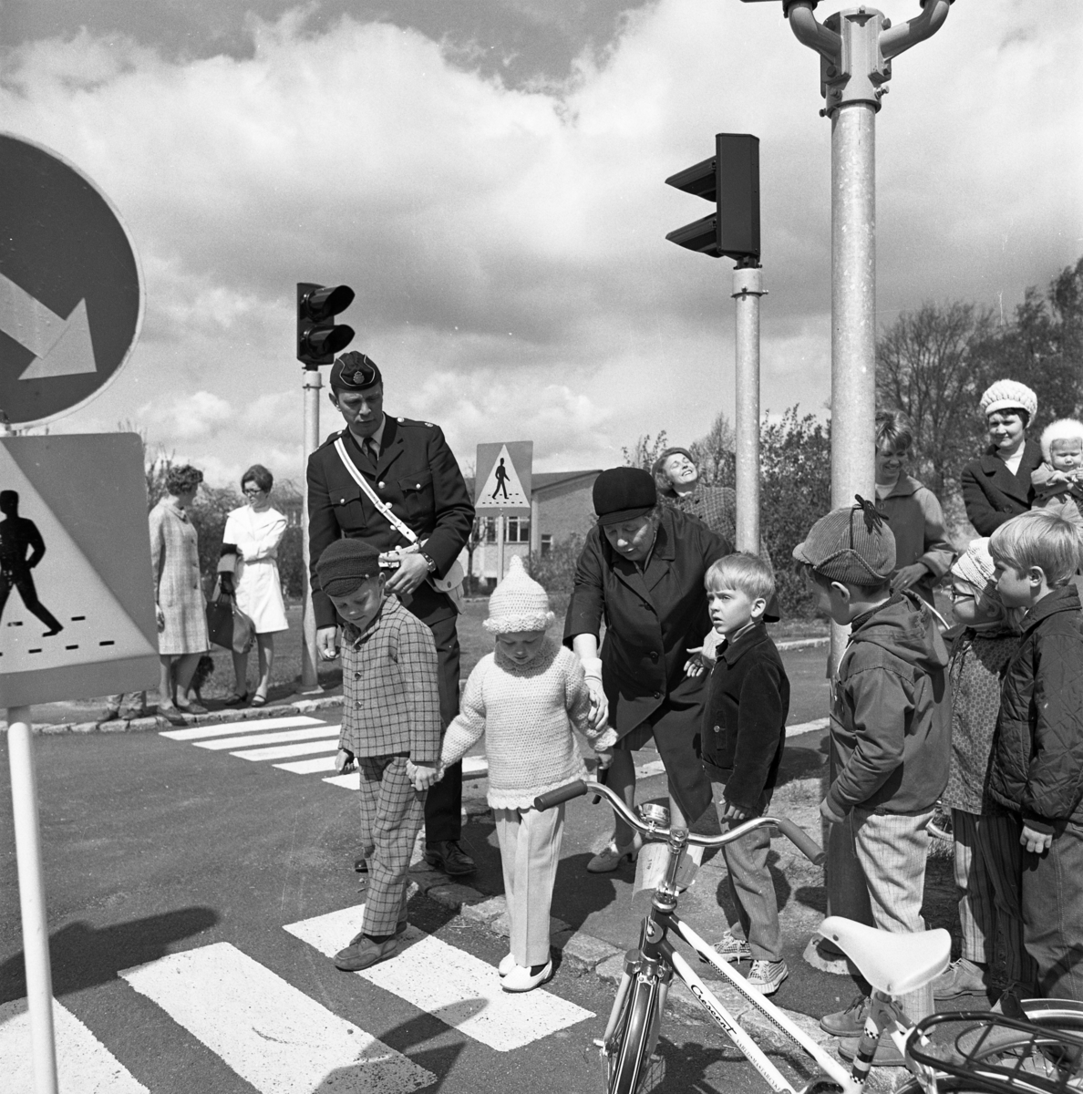 Trafiklekskola med polisman Leif Ekström, i uniform. Barnen får lära sig om trafikregler, trafikskyltar, övergångsställen och trafikljus. Några mammor och småsyskon är också med. I bakgrunden står två kvinnor med en hund. Gäddgårdsskolan skymtar till höger.