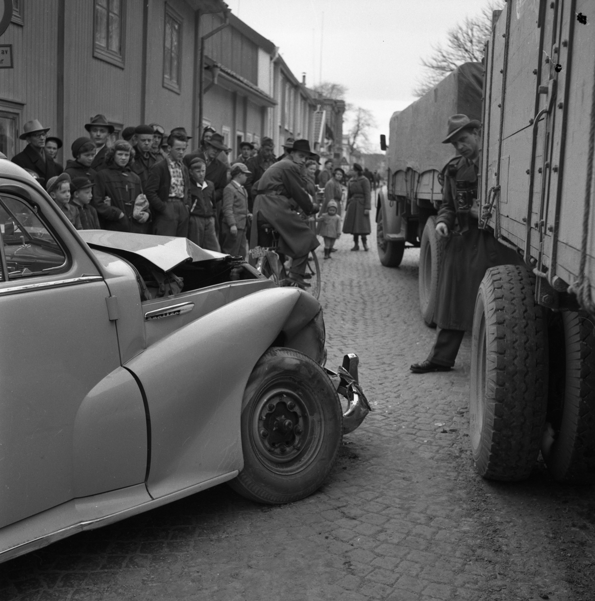 Trafikolycka. En personbil har krockat med ett lastbilssläp. Motorhuven och stötfångaren är skadade. Många människor har samlats för att se på. Till höger kommer en man med kamera.