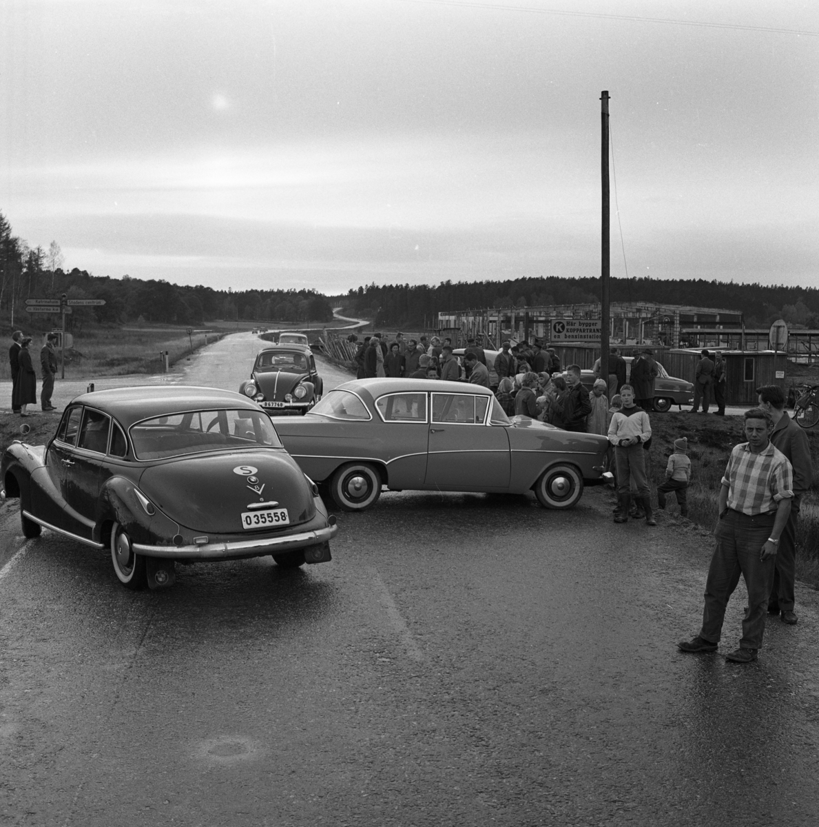 Två bilar har krockat på vägen mot Örebro. På vägskyltarna, till vänster, står det "Katrineholm", "Västermo kyrka" och "Stadens centrum". Till höger håller Koppartrans på att bygga en bensinstation.