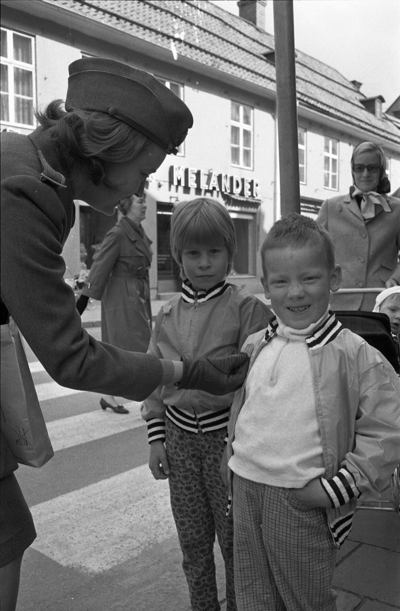 Trafikpropaganda. Bilkårist Britt-Marie Utterström delar ut höger-trafiks-märken. Här har en flicka och en pojke fått var sitt märke på jackan.