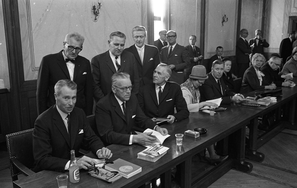 Sittande, från vänster: Gösta Bohman (utskottets ordförande 1965-1970, Högerpartiet)