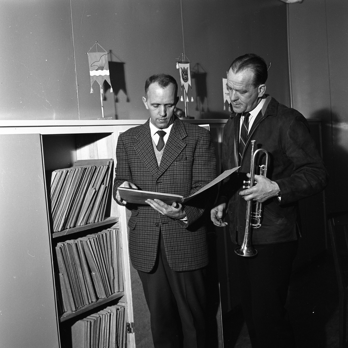 En man plockar fram noter, mannen bredvid håller i en trumpet