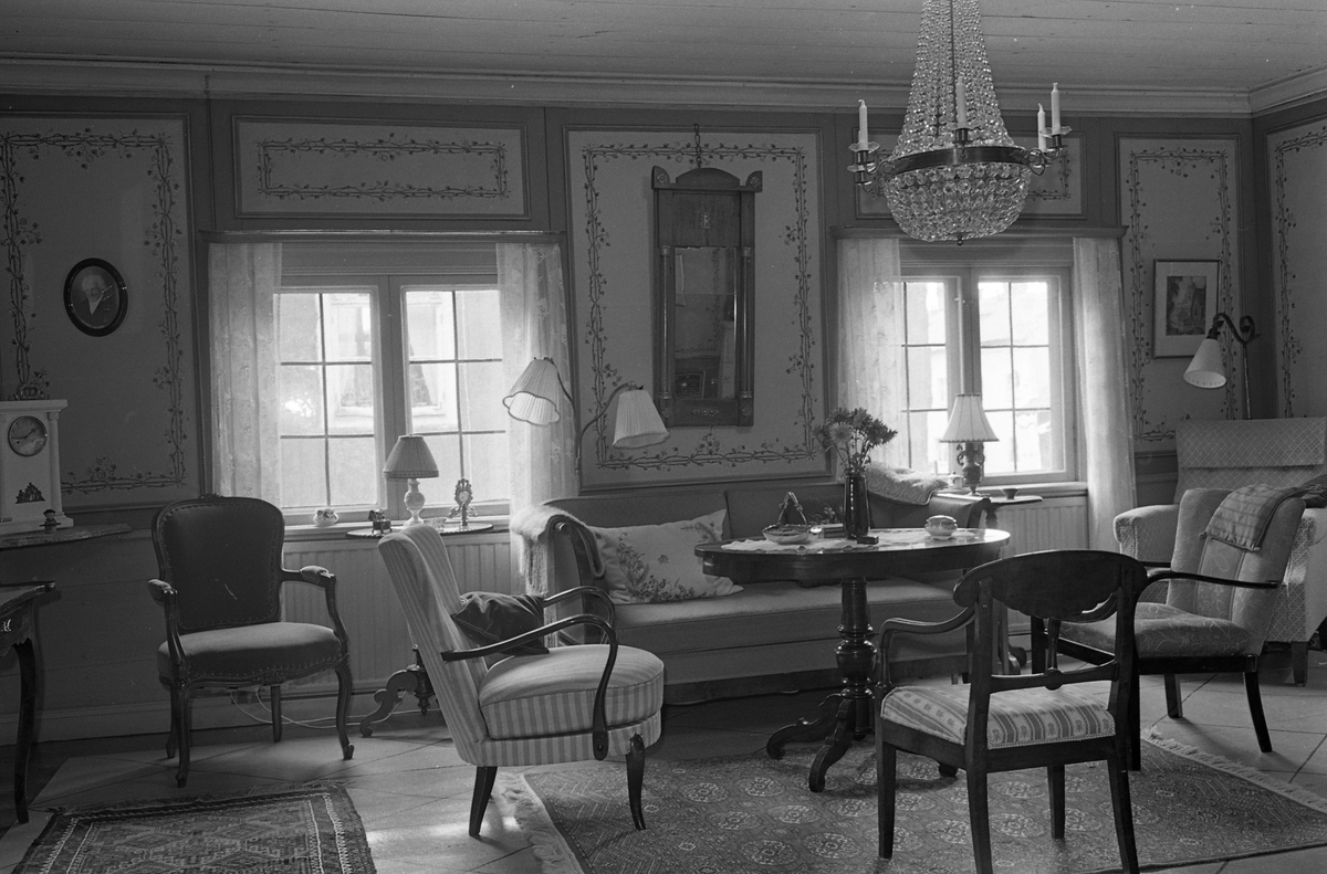 Rummet är högt i tak och har två fönster. Möblemanget består av soffa, pelarbord, karmstolar, väggspegel, golvlampor och bordslampor samt en kristallkrona i taket.