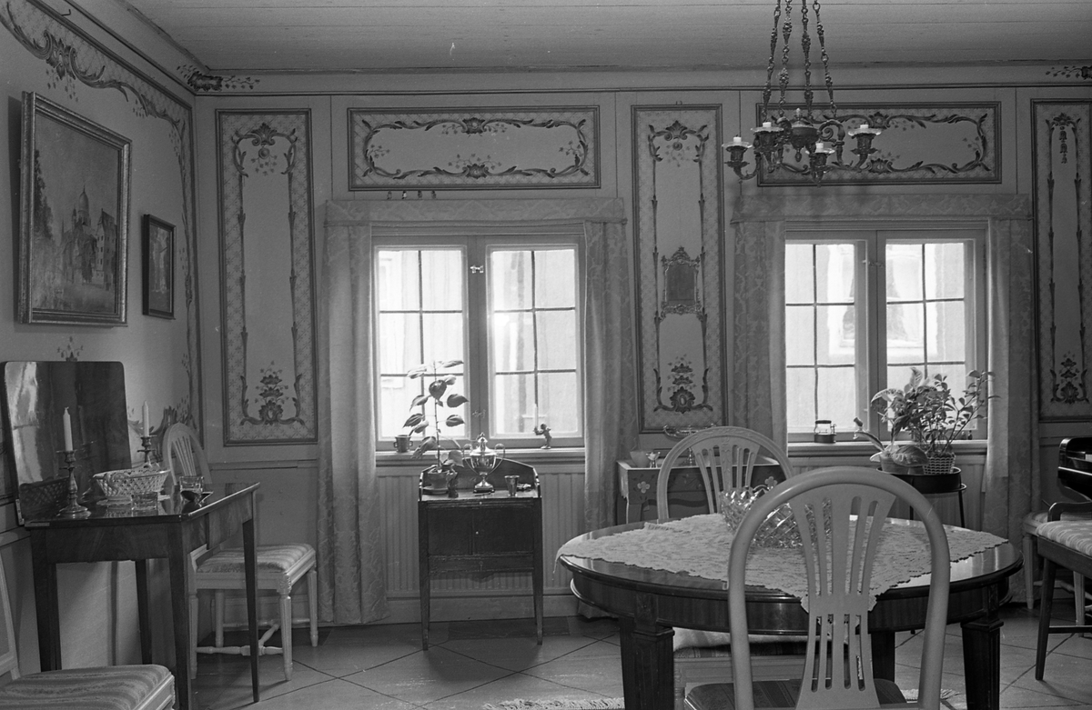 Bostadsinteriör, Crugska gården. Två fönster. Dekorerade väggar. Möblemanget består bland annat av fyra stolar och ett bord. Till höger anas ett piano med en pall framför.
