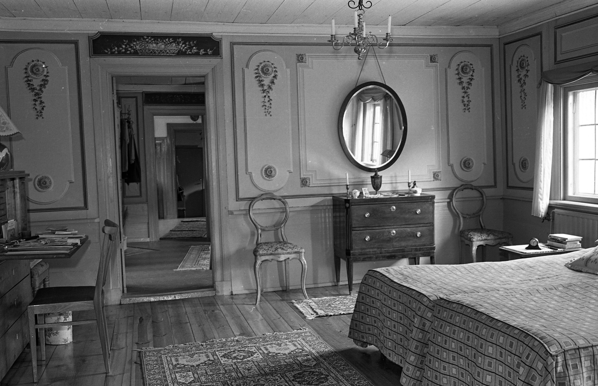 Bostadsinteriör, Crugska gården. Sovrum med två sängar. En chiffonjé med en stol framför, en byrå med en spegel över. Väggarna är dekorerade. Ett fönster. En ljuskrona i taket.