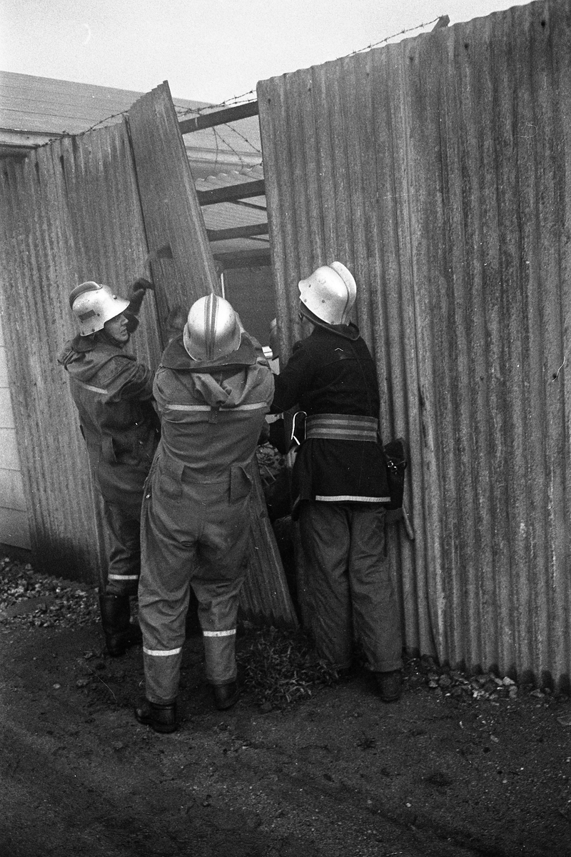 Det brinner i en verkstad på Norra Ågatan. Tre brandmän lossar en plåt för att kunna ta sig in. De är klädda i hjälm och skyddskläder.