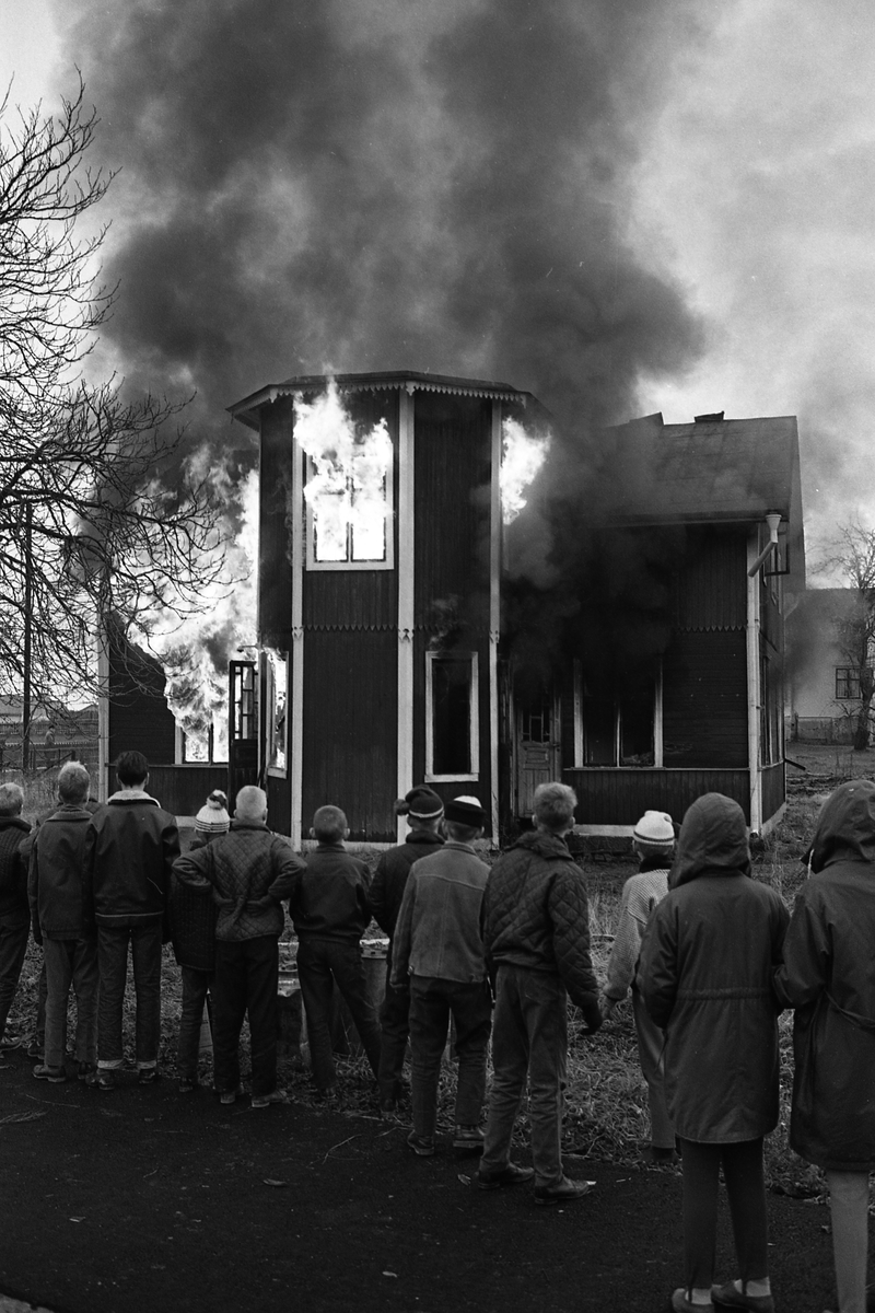Brandövning i Sverkesta. Ett trähus brinner. Elden ses i fönstren och svart brandrök stiger mot himlen. En bit i från står människor och ser på.