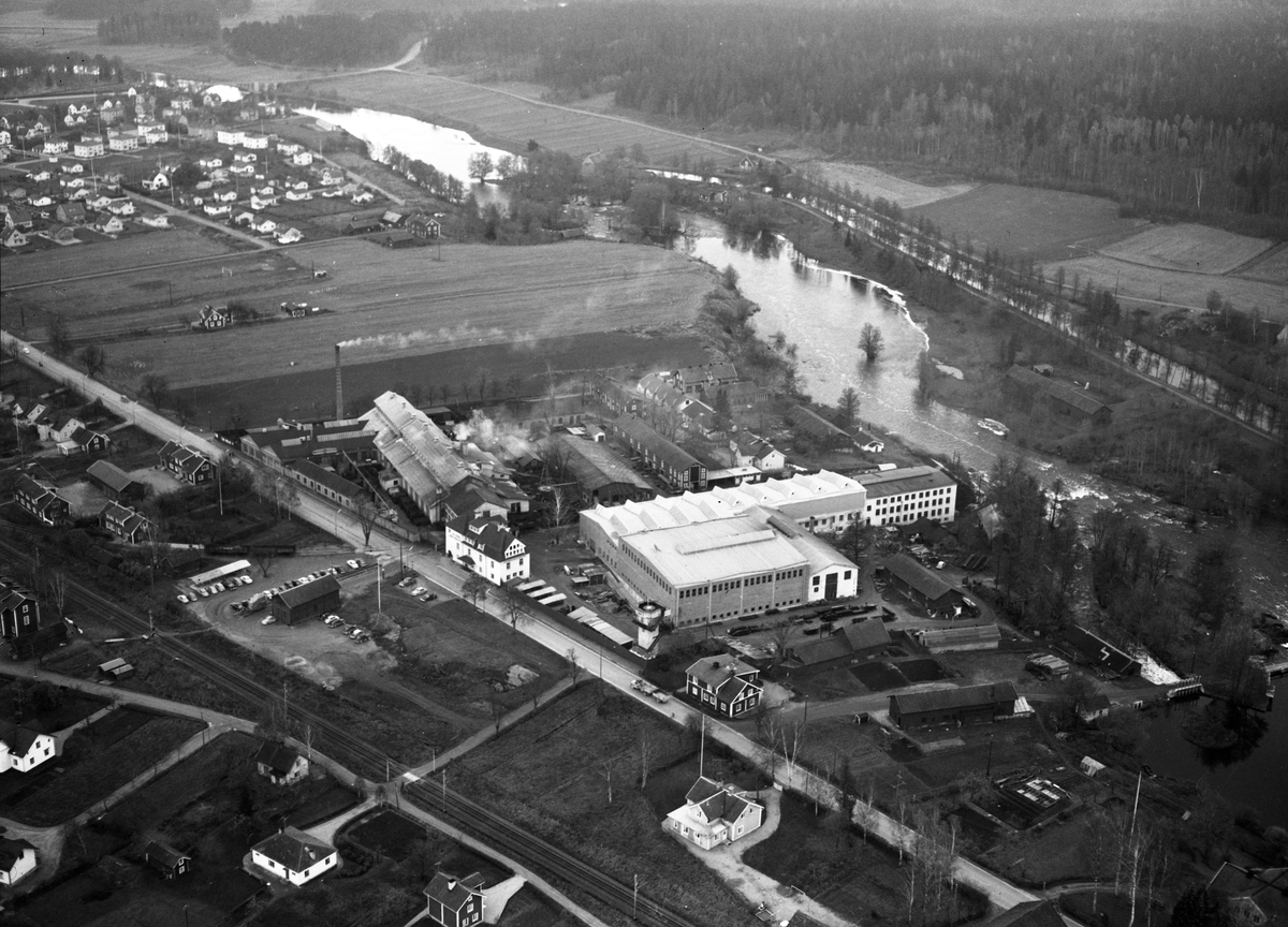 Arboga Mekaniska Verkstad, Meken. Flygbild. Verkstadsområdet ligger mellan Jädersvägen och Arbogaån.