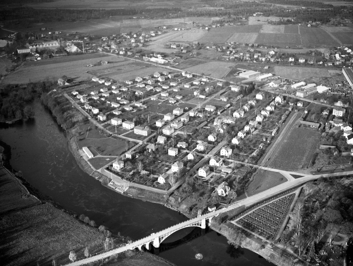 Flygbild över del av Arboga. Västerbron över Arbogaån. Villaområdet, till vänster om bron är Nästkvarn. I bildens övre vänstra hörn ses Meken.