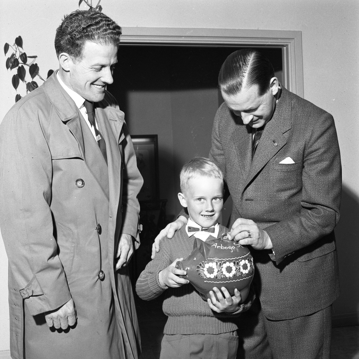Bankdirektör S E Zakrisson, från Sparbanken, belönar en liten sparare. Han stoppar en slant i spargrisen.