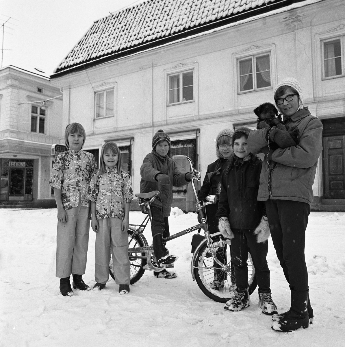 Barn med julklappar. Två flickor i nya kläder. En pojke med en minicykel. Flickan längst till höger har en hund i famnen.