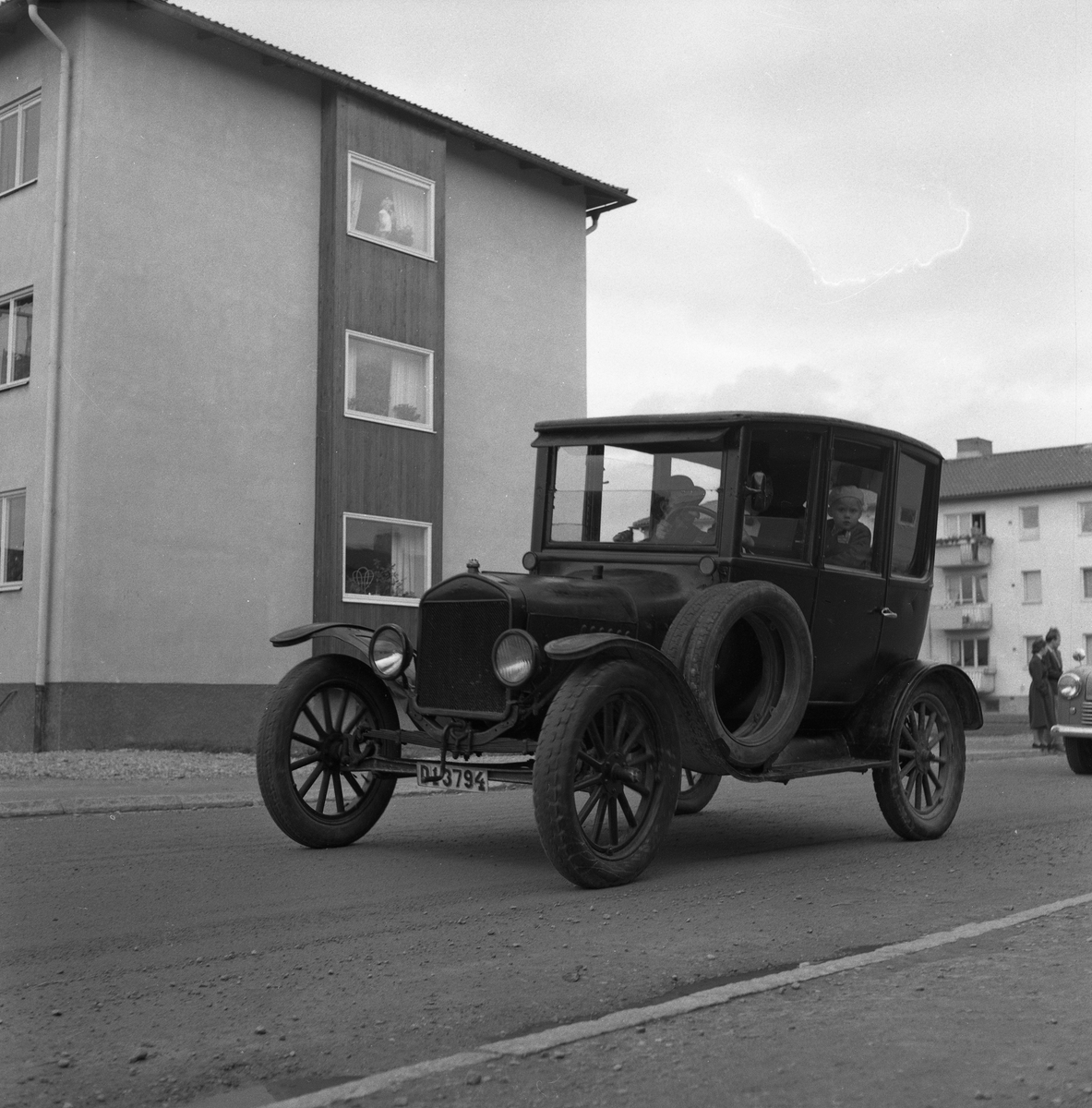 Barnens Dag. En pojke syns genom rutan på en gammal bil.