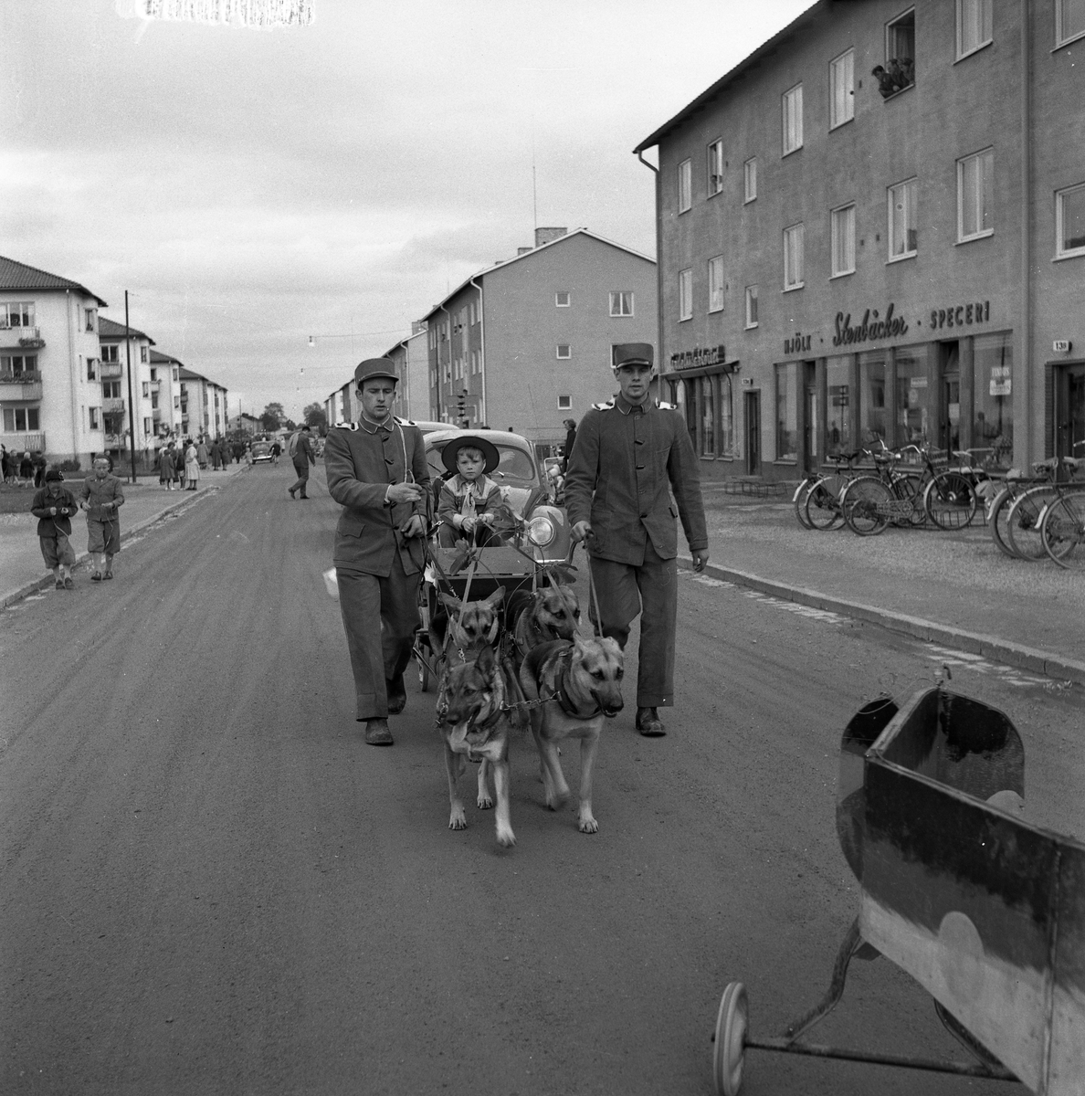 Barnens Dag. En pojke, utklädd till cowboy, åker fyrspann dragen av schäfrar. Två män i uniform går vid sidan av ekipaget. I bakgrunden ses Stenbäckers mjölk-och speceributik.