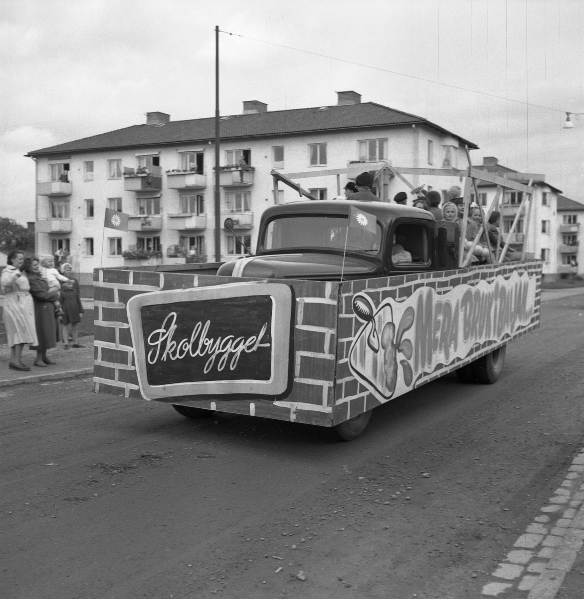 Barnens Dag firas. En lastbid kör i paraden. "Skolbygget" står det på en skylt i fronten. På flaket sitter flera barn.