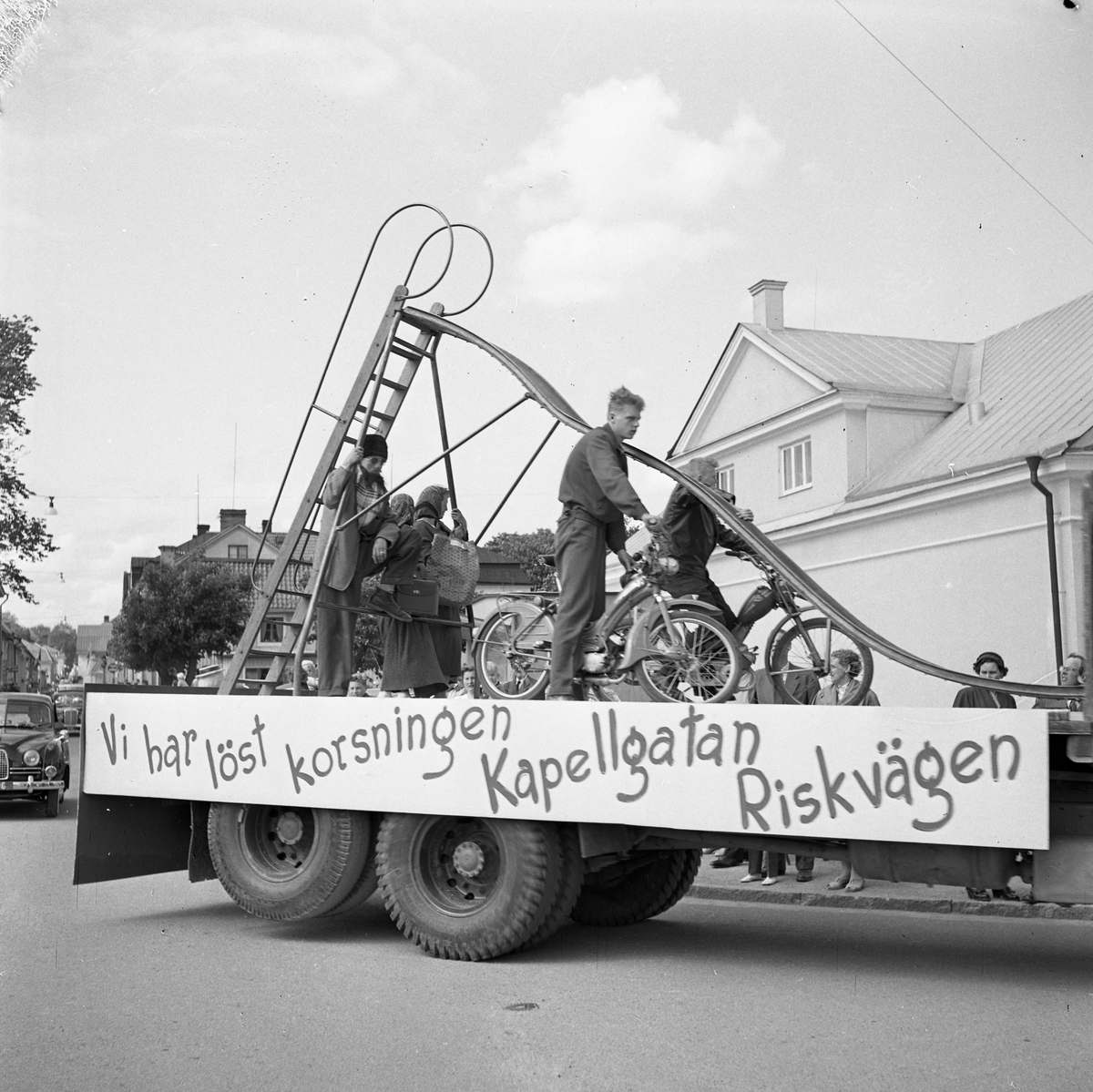 Barnens Dag firas. En lastbil med texten "Vi har löst korsningen Kapellgatan Riskvägen" och en rutschkana på flaket. Där står även två grabbar med var sin moped.