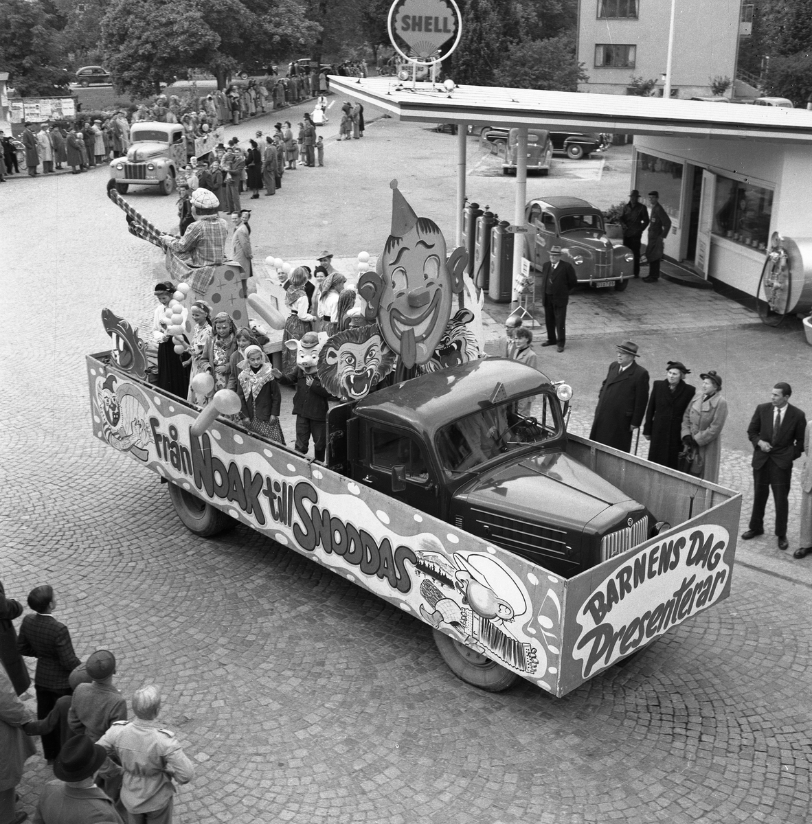 Barnens Dag firas med en kortege. Här ses en lastbil med barn på flaket. Texten, längs lastbildssidan, lyder "Från Noak till Snoddas". Lastbilen passerar Shellmacken vid Jädersvägen och Jäderstullen. Publik kantar vägen.