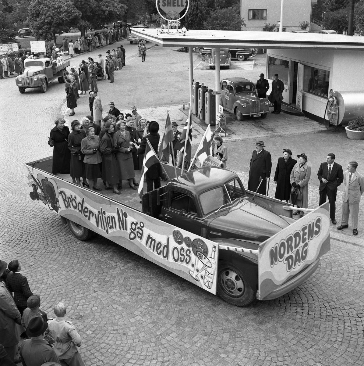 Barnens Dag firas med en parad genom staden. Här är en lastbil med texterna "Bröder viljen ni gå med oss" och "Nordens dag". På flaket står en grupp kvinnor. Möjligen är de en kör. Bilen är dekorerad med Nordiska flaggor. Lastbilen kommer från Jädersvägen och rundar Shellmacken vid Jäderstullen. Publiken kantar vägen.