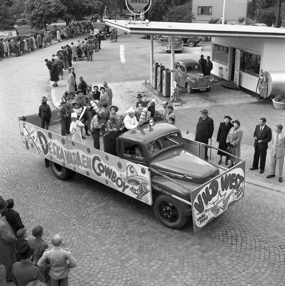Barnens Dag firas med en parad genom staden. "Det ska vara en cowboy" står det på lastbilen. På flaket står barn i cowboyhattar och rutiga skjortor. Lastbilen kommer från Jädersvägen och passerar Shellmacken vid Jäderstullen. Publik kantar vägen.