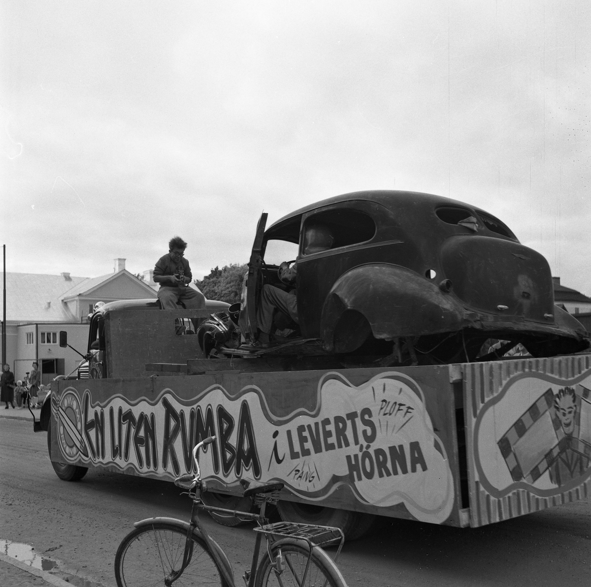 Barnens Dag firas med en parad genom staden. Här är en lastbil som kör runt med en havererad bil på flaket och fotograf Lasse Åhlin sittande ovanpå hytten. "En liten rumba i Leverts hörna" står det längs flaket. I Levert hörna skedde en del trafikolyckor, därav texten. Lasse fick ofta uppdrag, av polisen, att ta bilder på trafikolyckor.