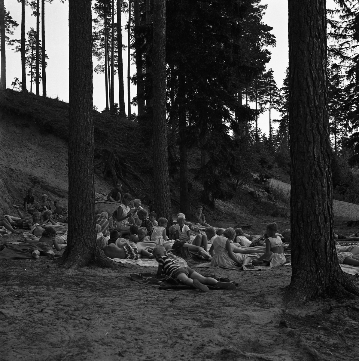Barnens Dags koloni i Högsjön. En "fröken" har högläsning ur en bok. Barnen ligger på filtar i sluttningen.