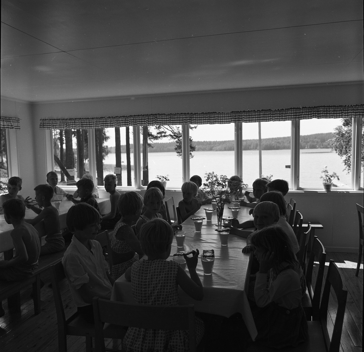 Mellanmål vid Barnens Dags koloni i Högsjön, väster om Arboga. De många fönstren erbjuder en vacker utsikt, över sjön. Barnen sitter vid två långbord och dricker mjölk och äter knäckebröd.