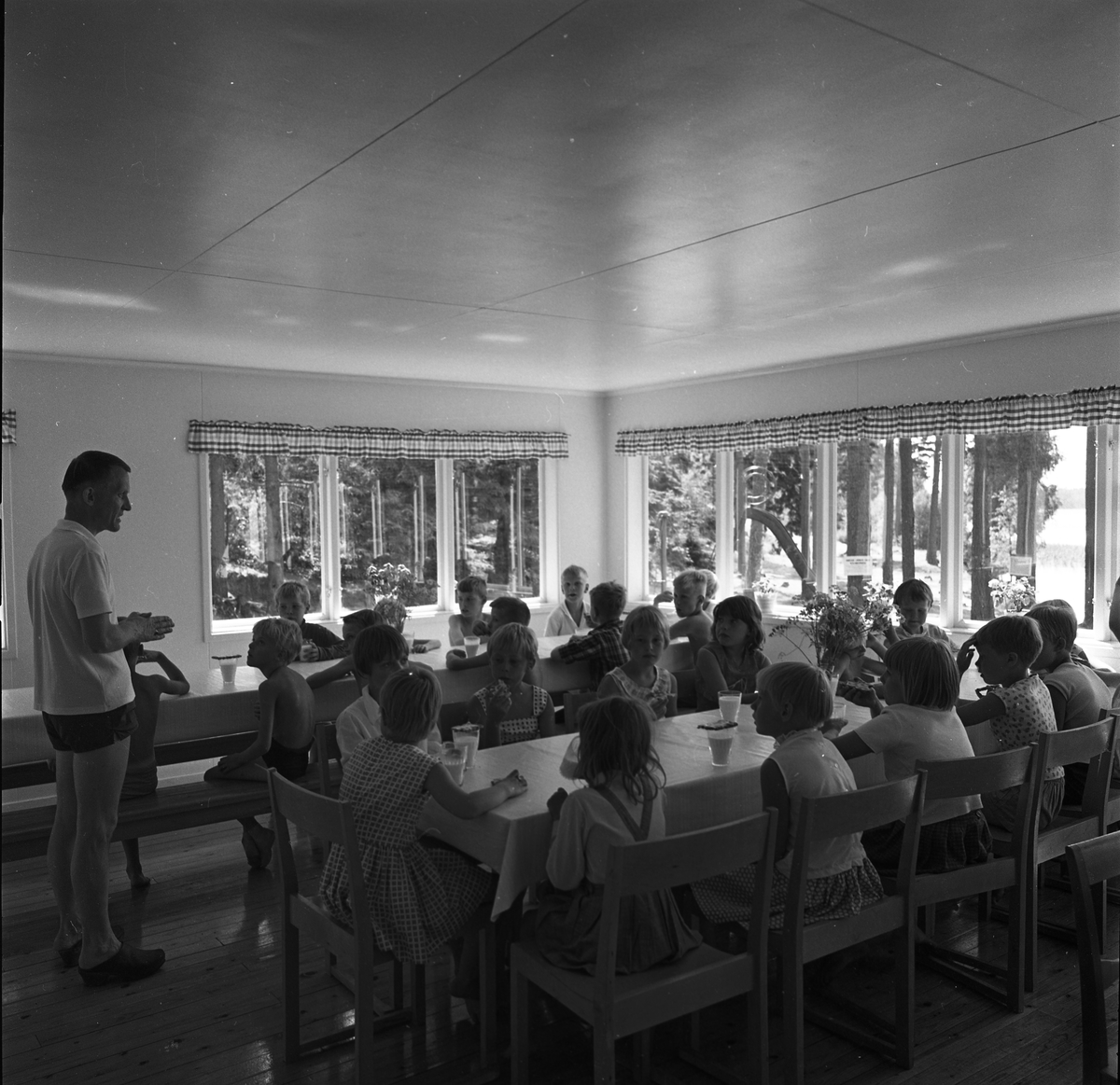 Barnens Dagskolonin vid Högsjön, väster om Arboga. Barnen sitter vid två långbord, dricker mjölk och äter knäckebröd. En ledare, iklädd shorts, berättar.