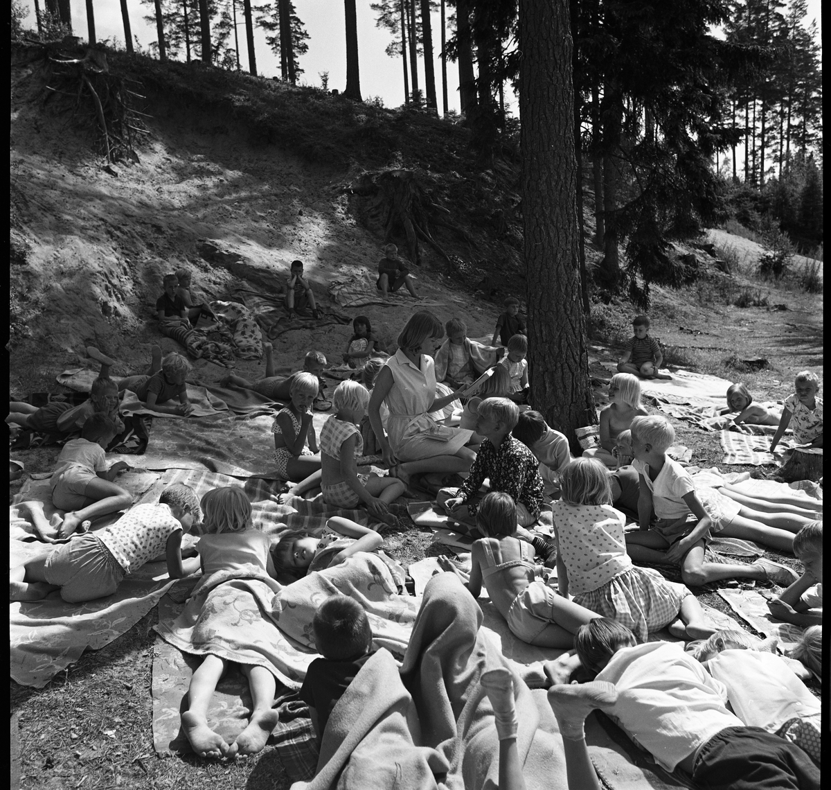 Barnens Dagskolonin vid Högsjön, väster om Arboga. En "fröken" har högläsning medan barnen ligger på filtar, i sluttningen, och hör på.