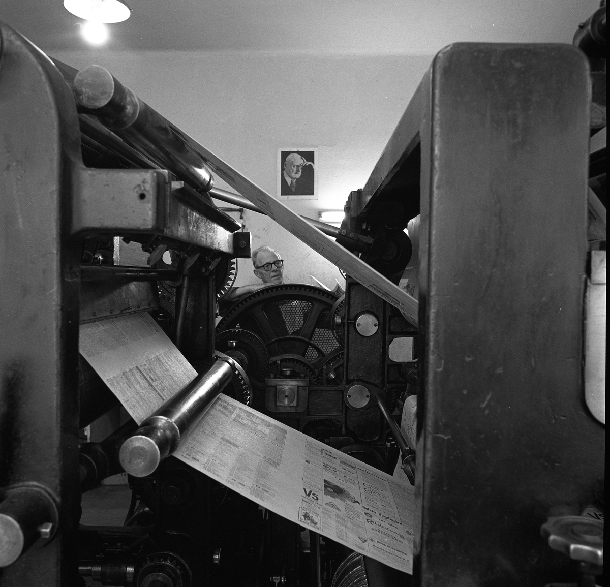 En man arbetar vid tryckpressen. Tryckta tidningssidor rullar mellan valsarna medan mannen kontrollerar maskinen.