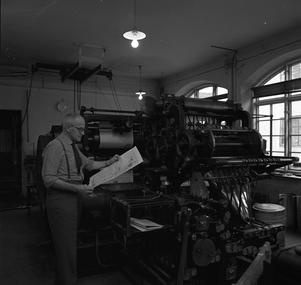 Arboga Tidning, personal och interiör. En man står intill tryckpressen. Han läser en tidning. De stora valsarna matar fram nytryckt papper.