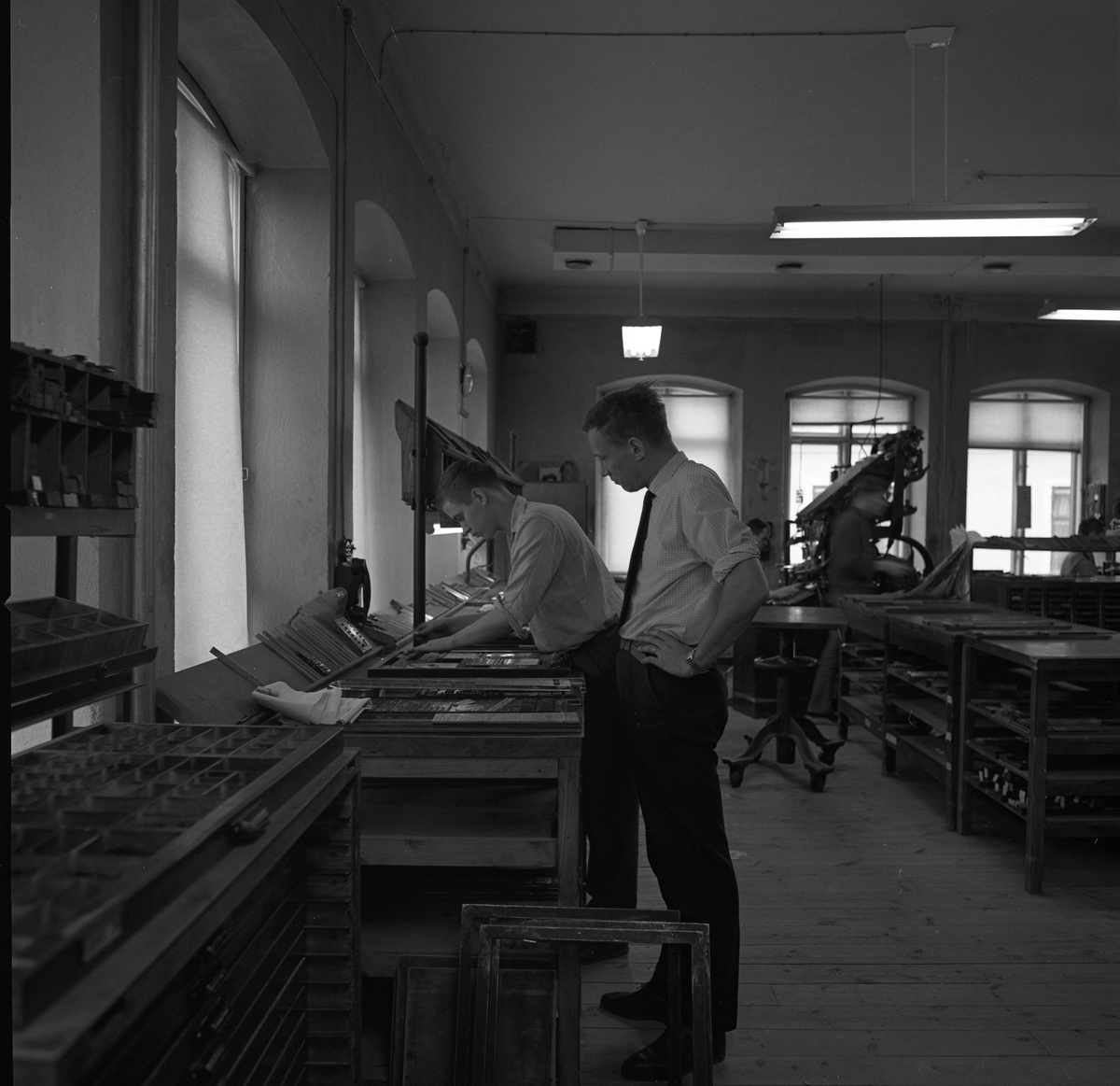 Flera personer arbetar i lokalen. Fack med typer ses i förgrunden. En man bygger en tidningssida.