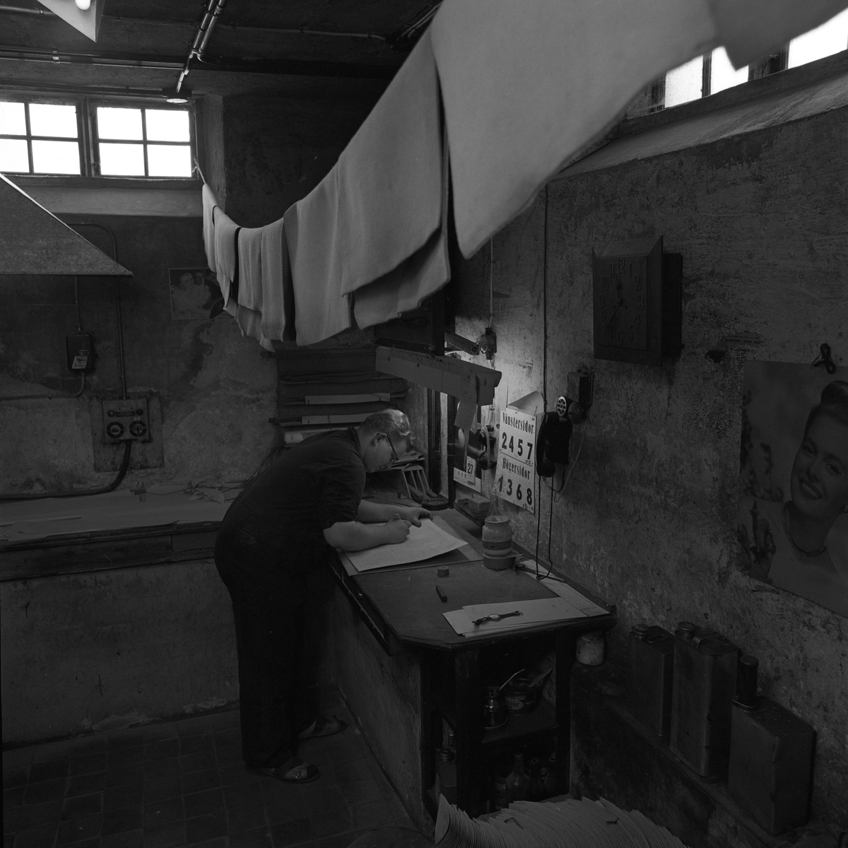 Arboga Tidning, personal och interiör. En man arbetar i en källarlokal. Han står böjd över ett arbetsbord. Han arbetar med ett handredskap. En bit bort ligger hans armbandsur. Framför honom står två skyltar med benämningarna "Vänstersidor" och "Högersidor". På väggen hänger en telefon, en klocka och ett par bilder. Under arbetsbordet skymtar en oljekanna. Bredvid står några dunkar med kemiska medel. Över mannen är en lina uppspänd. Där hänger rektangulära textilier.