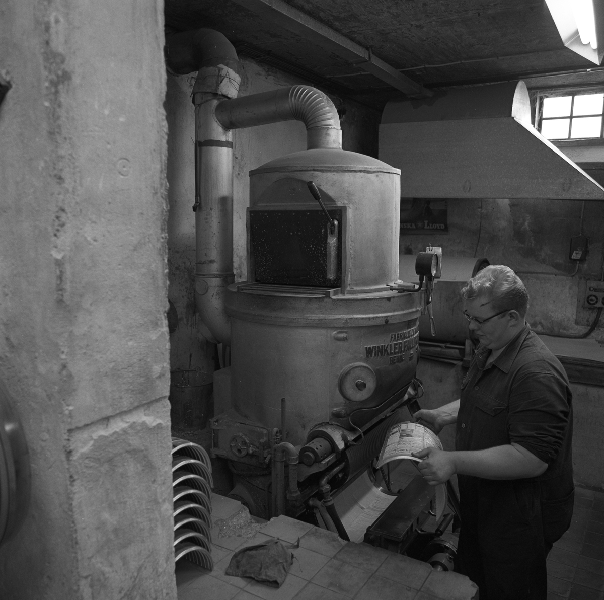 Arboga Tidning, personal och interiör. En man, iklädd overall, arbetar vid en maskin. Han håller i en plåt som används för att trycka en tidningssida. Flera plåtar syns till vänster i bild. Mannen vistas i en källarlokal.