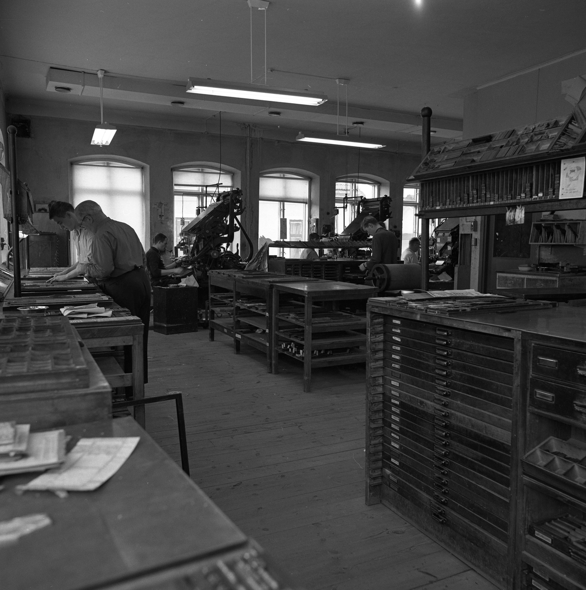 Arboga Tidning, personal och interiör. Sex män arbetar i rummet. Männen till vänster bygger tidningssidor med typer. Längst bort i lokalen står tre maskiner. Arbetsbord och skåp med lådor ses i bilden.