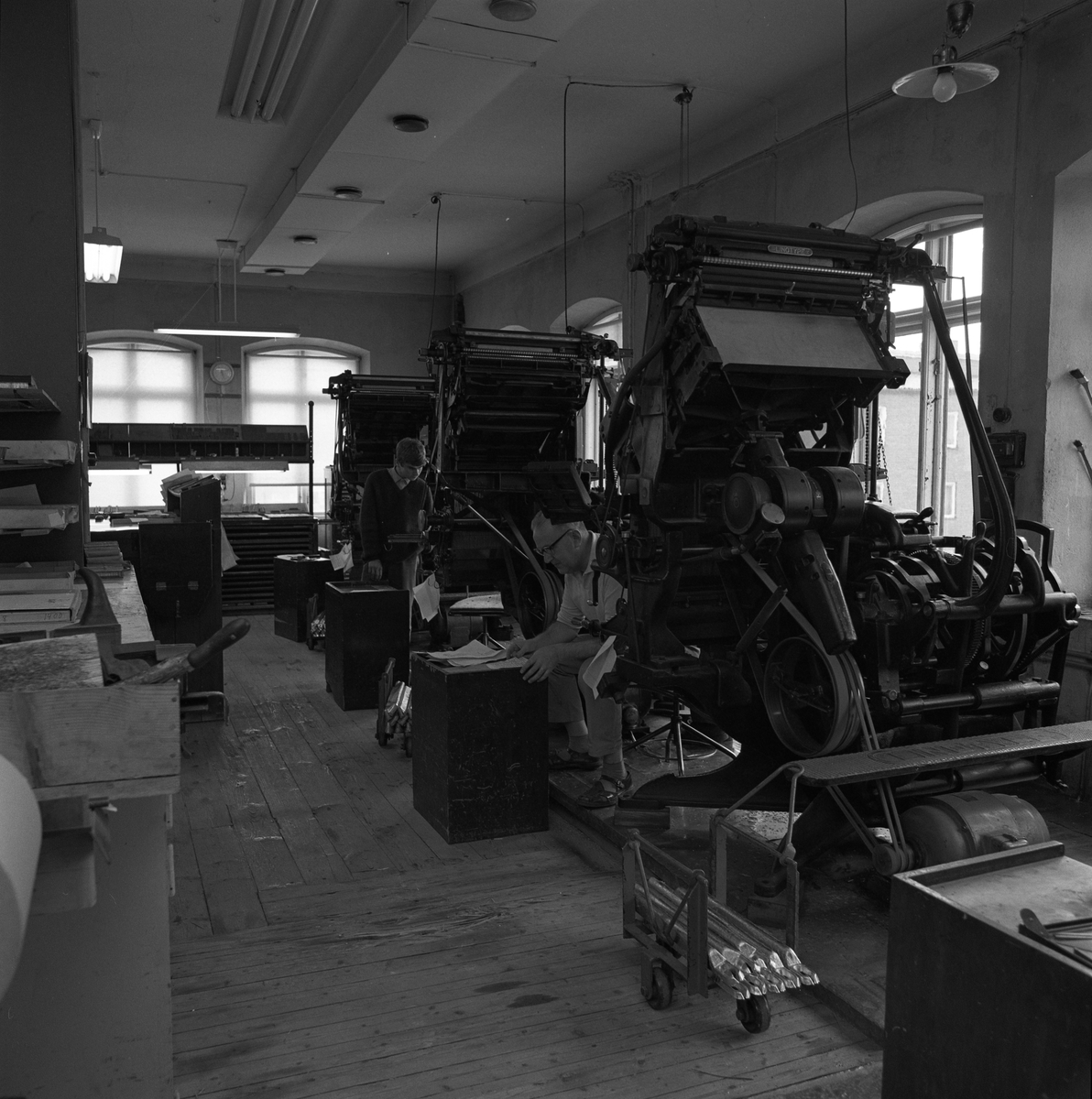 Två män arbetar i tryckeriet. Tre tryckpressar