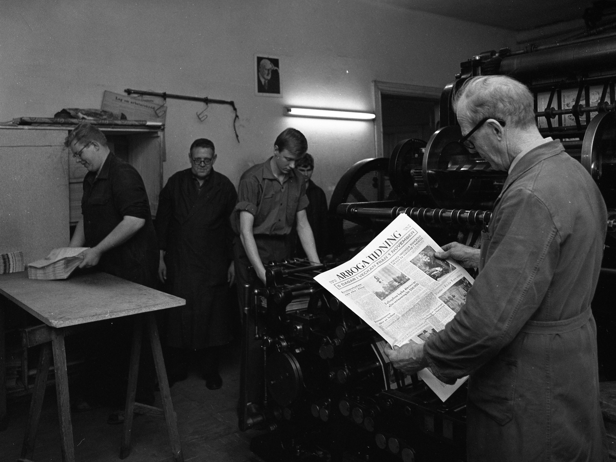 Arboga Tidning, personal och interiör. Fem män står i tryckeriet. Nummer två från vänster är Nils Munther. En man håller i en bunt tidningar, en annan man håller i ett färskt exemplar.