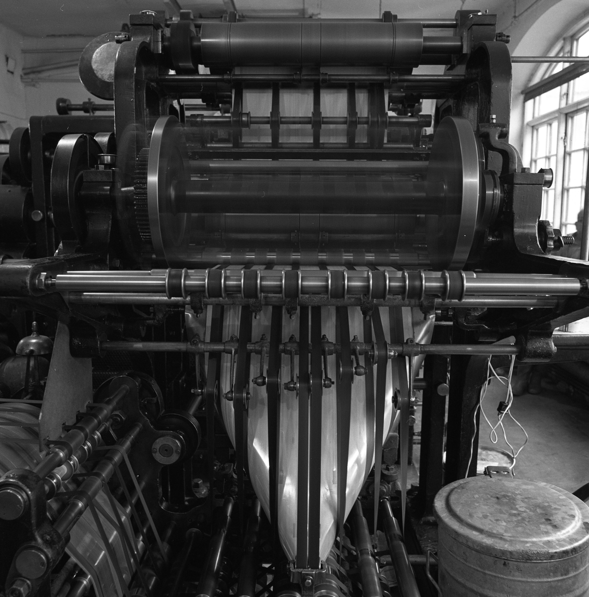 Arboga Tidning, interiör. Tryckpress i arbete. Tidningspapperet rusar över valsarna. En soptunna syns i förgrunden och ett fönster syns i bakgrunden.