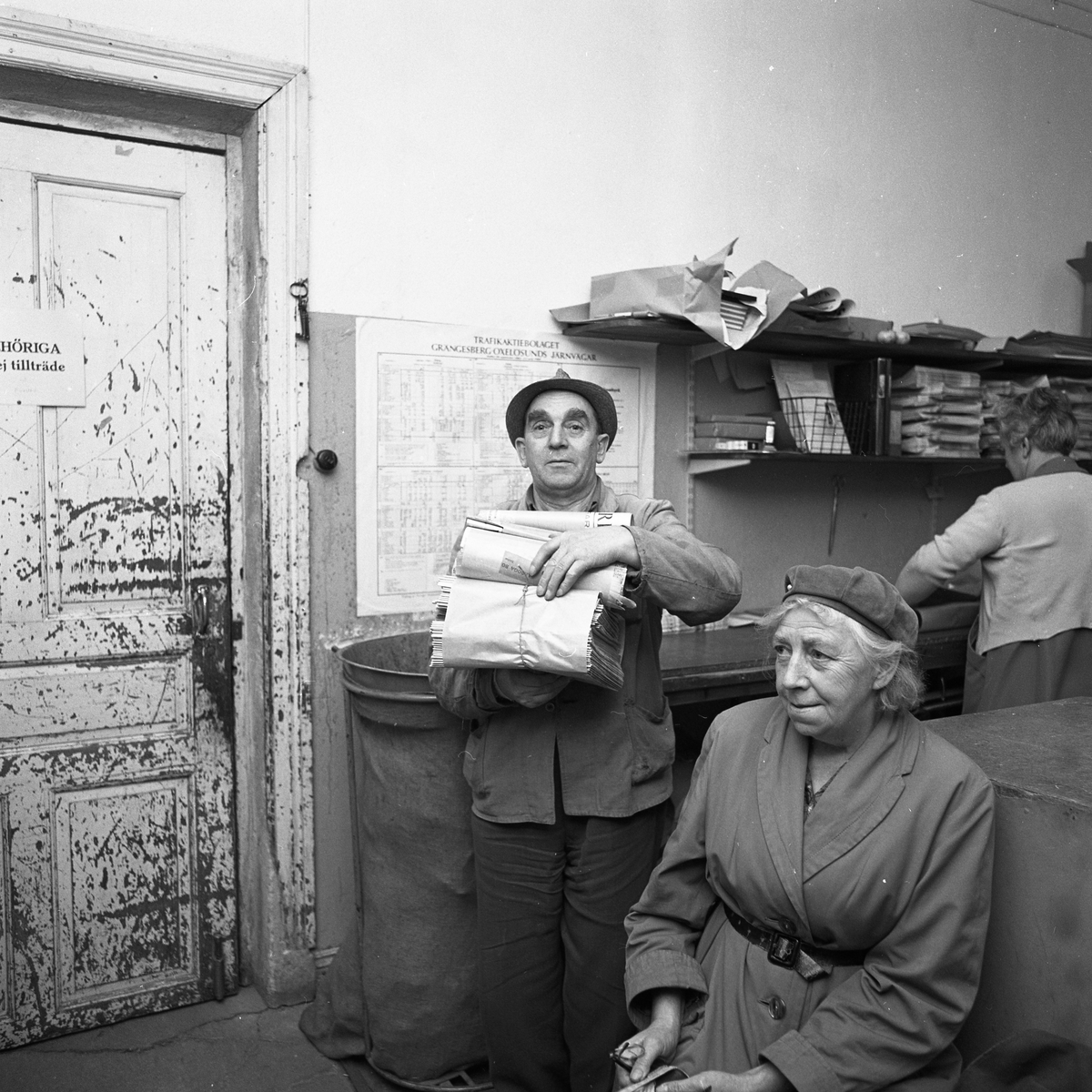Arboga Tidning distribueras. En man håller en trave tidningar i famnen. I bakgrunden syns en kvinna som packar tidningar. I förgrunden sitter en kvinna, klädd i ytterkäder. Möjligen väntar hon på tåget. På väggen finns TGOJ´s tågtidtabell. Dörren, till vänster, är mycket sliten.
