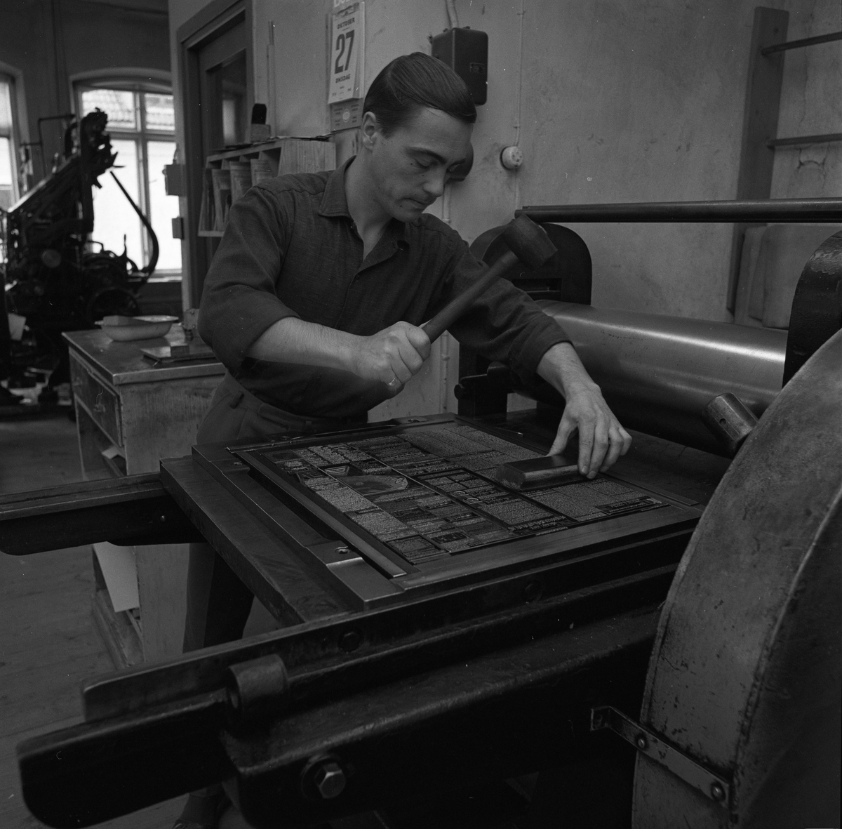 Arboga Tidning, personal och interiör. En man sätter en tidningssida. Han håller en gummiklubba i handen. På väggen hänger en almanacka. En stor maskin skymtar i bakgrunden.