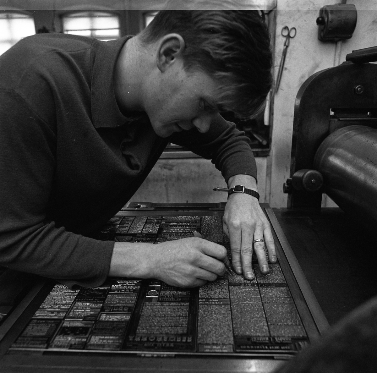 Arboga Tidning, personal och interiör. En man arbetar med typer vid en maskin. Han har en pincett i handen. På väggen ses en sax och en strömbrytare. Lokalens höga fönster syns i bakgrunden.