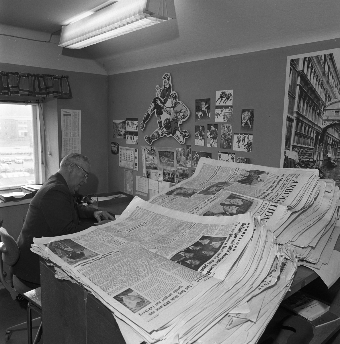 Arboga Tidning, personal och interiör. Journalisten vid sitt skrivbord på sportredaktionen. På väggen, framför skrivbordet, sitter diverse sportfotografier och andra bilder. I förgrunden ses två högar med tidningar.