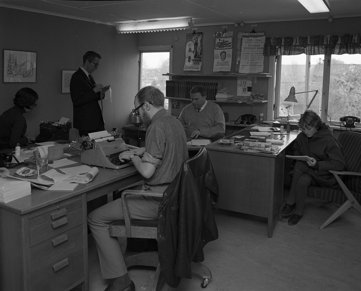 Arboga Tidning, personal och interiör. Fem personer på kontoret. Tre journalister arbetar vid sina skrivmaskiner. En person sitter vid skrivbordet och läser anteckningar. En man står upp och har ett långt papper i handen. På skrivborden syns telefoner, askfat och tidningar. På väggen, mellan fönstren, hänger bio- och teater affischer.