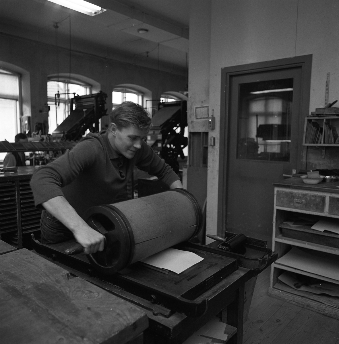 Arboga Tidning, personal och interiör. En man med en vals. I bakgrunden syns flera maskiner, en arbetsbänk och en dörr till ett annat rum.